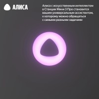 Алиса в Станции Мини 3 Про стала ещё умнее. Она умеет выполнятьнесколько команд подряд, подбирать музыку под настроение, включатьподкасты, находить ответы на сложные вопросы и управлятьустройствами умного дома. Команды обрабатываются быстро, а тридинамика обеспечивают более насыщенное и объёмное звучание, делаяпрослушивание комфортным и выразительным.